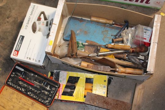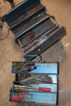 TWO BOXES OF MIXED TOOLS AND PARTS ETC PLUS TWO TOOL BOXES