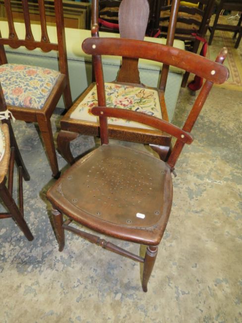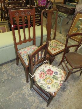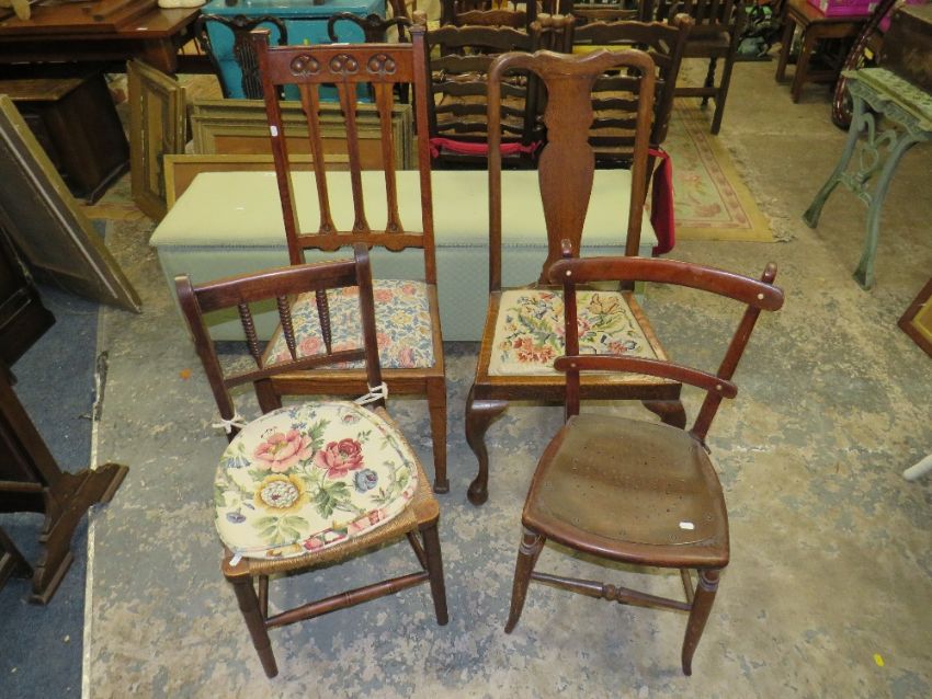 AN OAK ART NOUVEAU CHAIR, THREE ASSORTED CHAIRS (4)