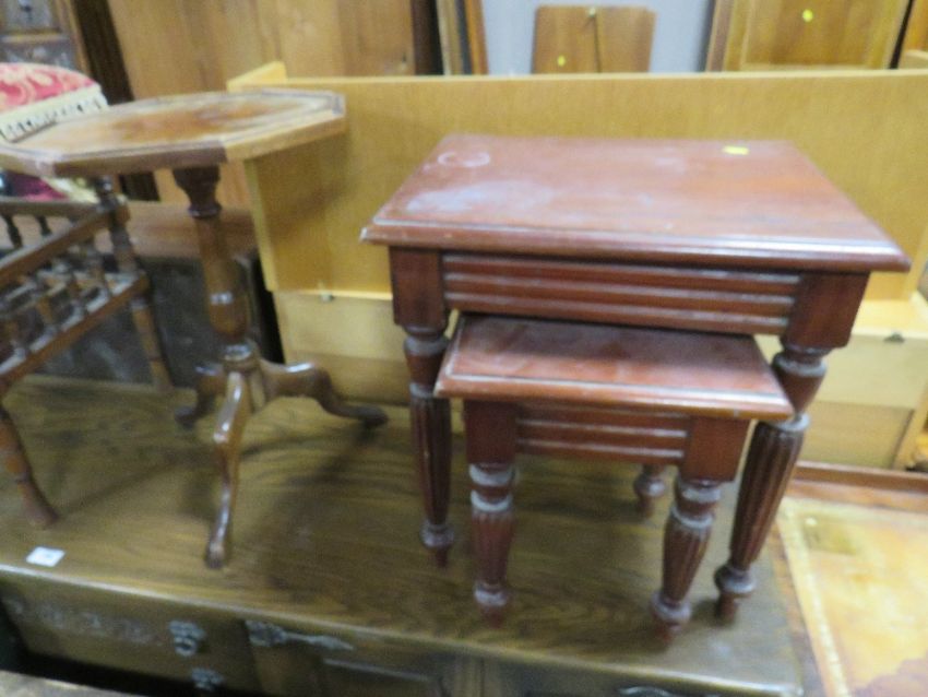 AN EDWARDIAN MAHOGANY STOOL, TWO WINE TABLES AND TWO MODERN OCCASIONAL TABLES (5)