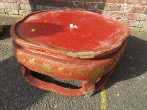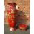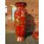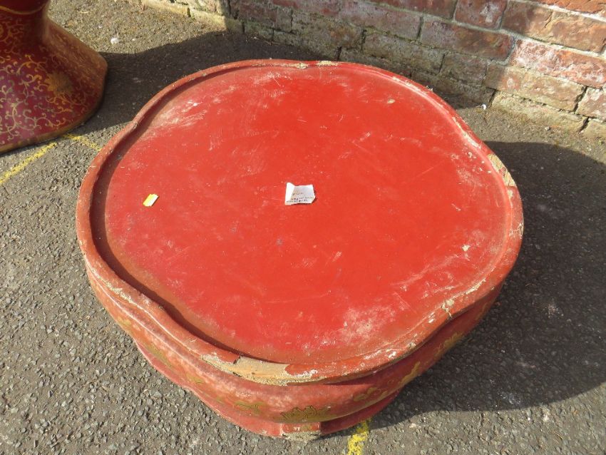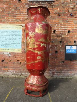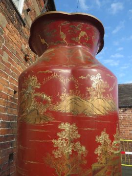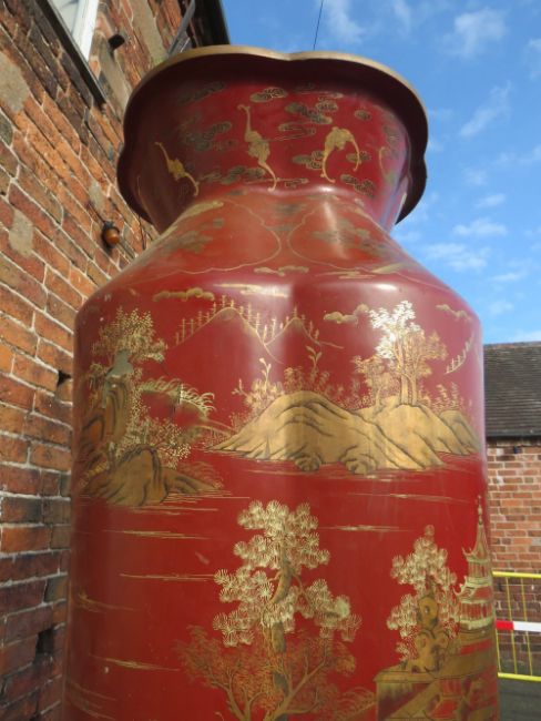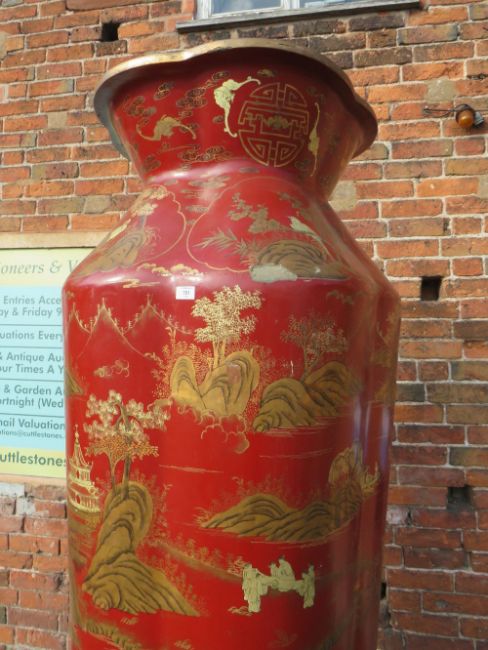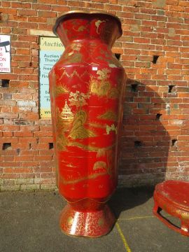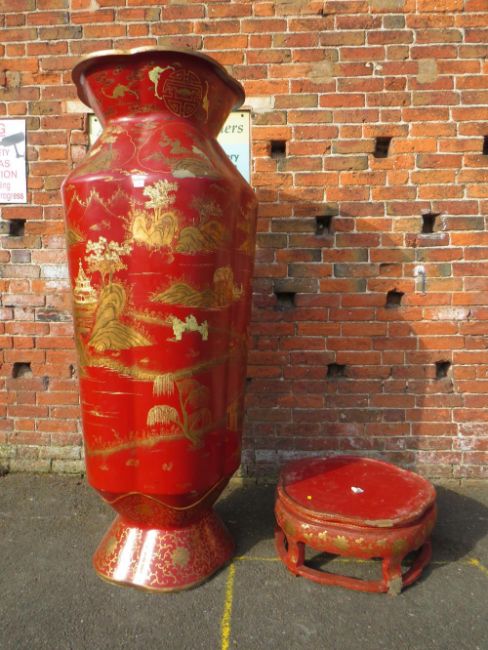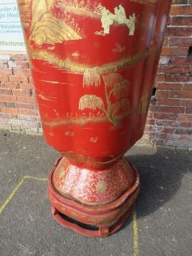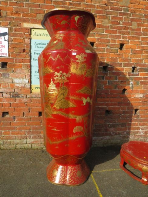 A HUGE AND IMPRESSIVE ORIENTAL STYLE BALUSTER VASE ON SHAPED STAND WITH GILT CHINNOISERIE STYLE DECORATION H-222CM W-75 CM A/F POSSIBLY RESIN / FIBREGLASS ;