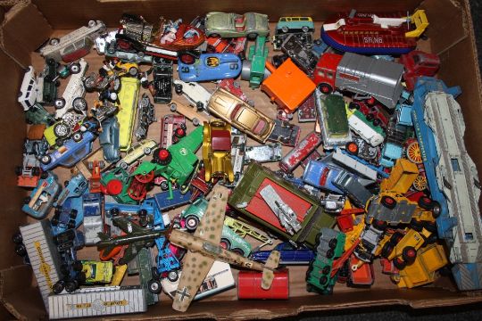 A QUANTITY OF VINTAGE DIE CAST TOY CARS AND VEHICLES TO INCLUDE DINKY, CORGI, LESNEY ETC.