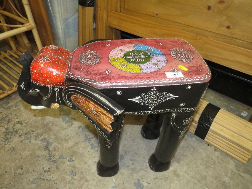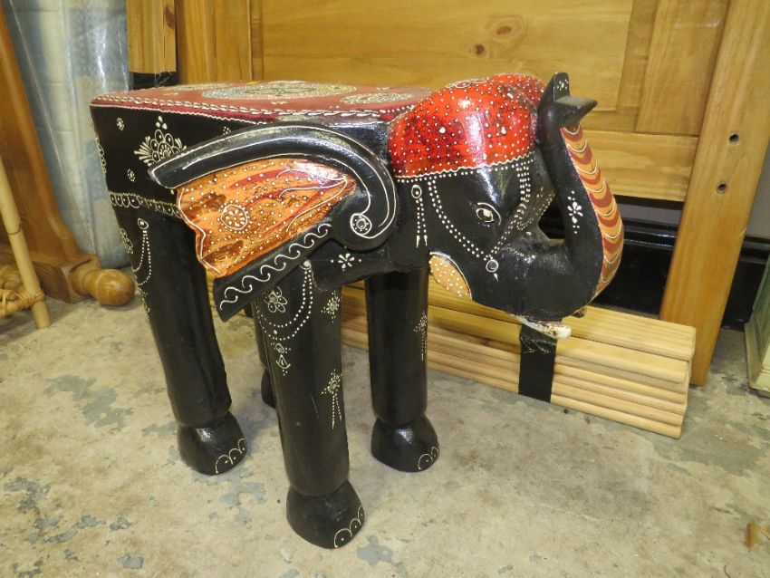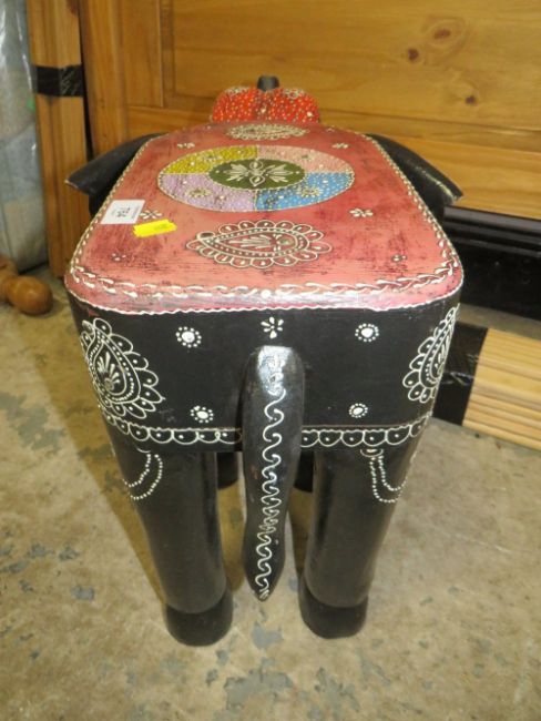 AN UNUSUAL EBONISED AND PAINTED ELEPHANT STAND H-46 L-55 CM