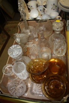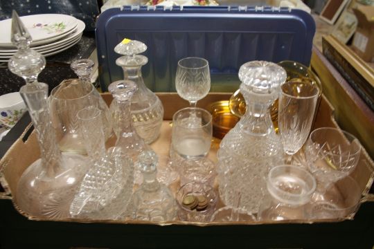 A TRAY OF ASSORTED GLASSWARE TO INCLUDE DECANTERS ETC