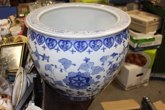 A TRAY OF ASSORTED CERAMICS ETC TO INCLUDE A LARGE CHINESE STYLE BLUE AND WHITE FISH BOWL H 30 CM