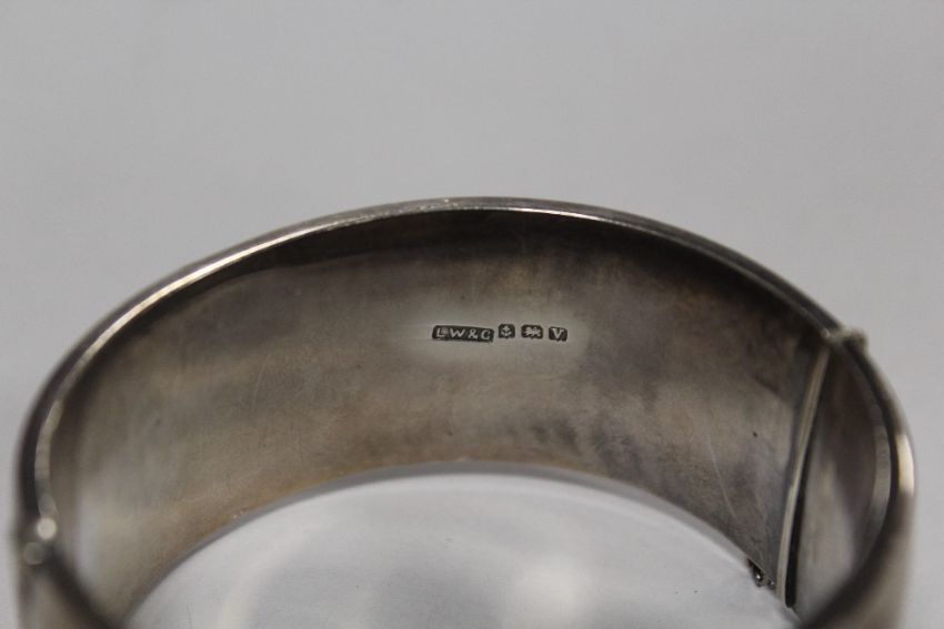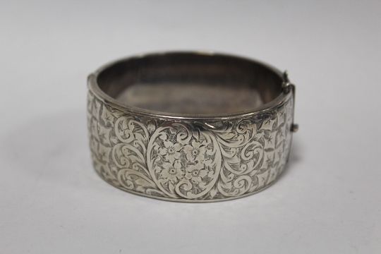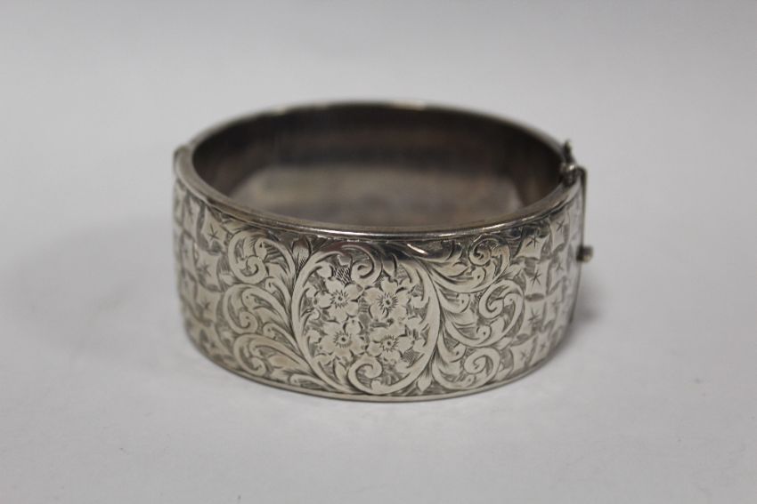 A HALLMARKED SILVER FLORALLY ENGRAVED BANGLE APPROX WEIGHT 47.6 G
