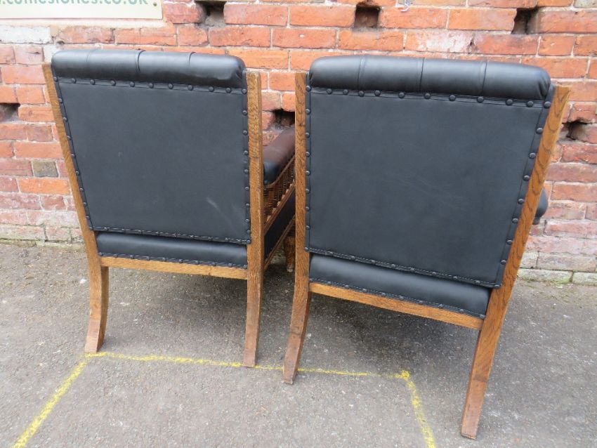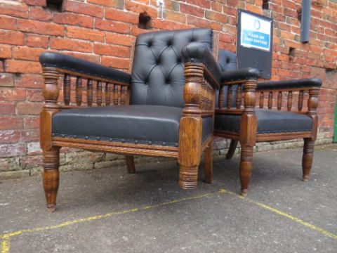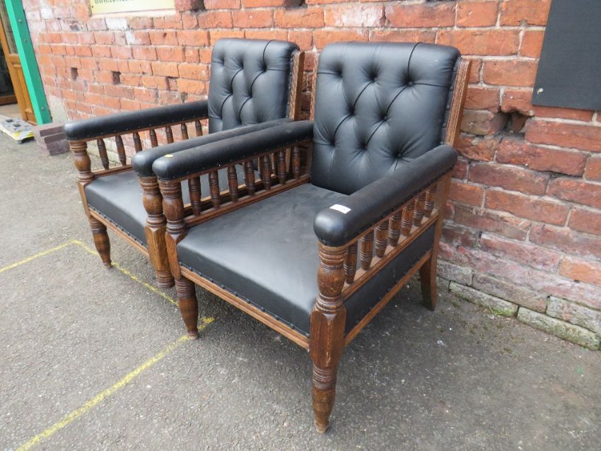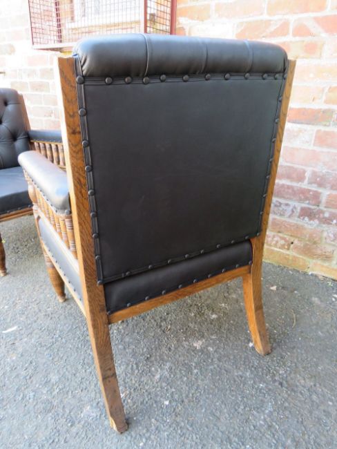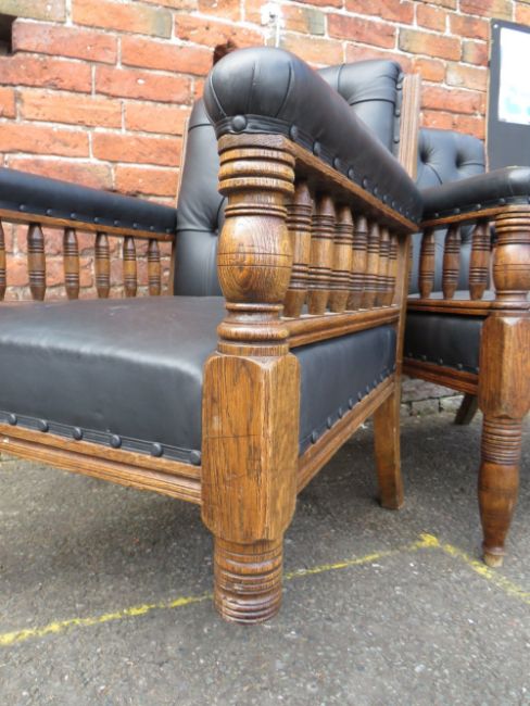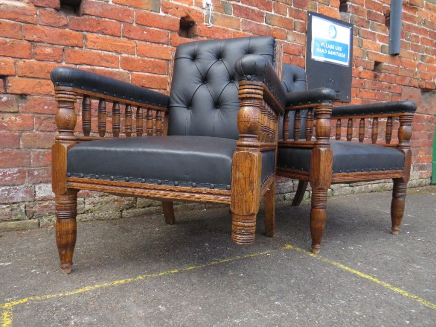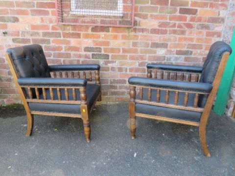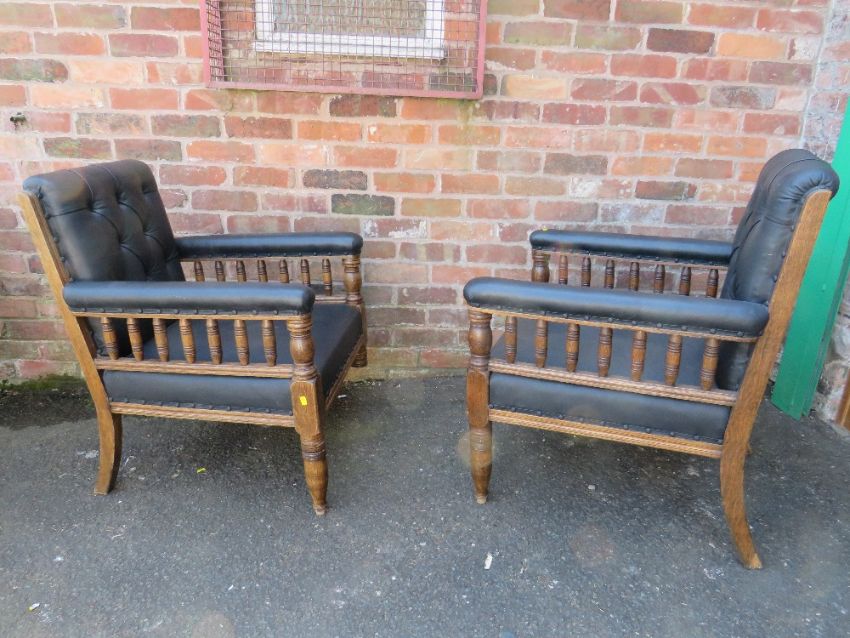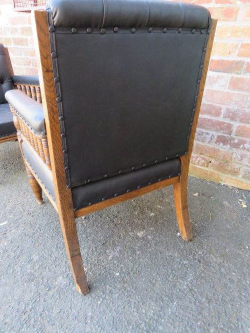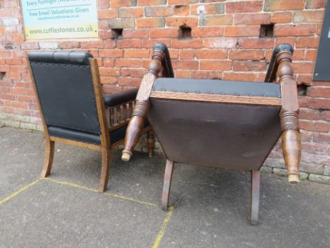 A PAIR OF EDWARDIAN OAK LIBRARY ARMCHAIRS WITH TURNED SUPPORTS (2) A/F