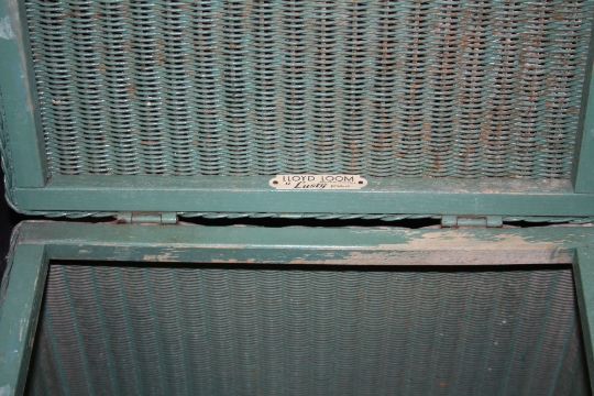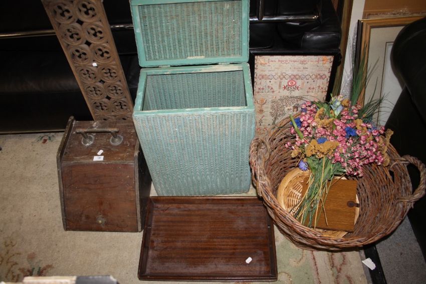 A LLOYD LOOM LUSTY LINEN BASKET, TOGETHER WITH A LARGE TWIN HANDLED LOG BASKET, MAHOGANY PURDONIUM ETC. (7)