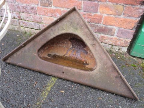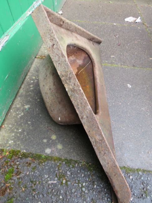 A CAST METAL CORNER FEEDING TROUGH, W 94 cm, D 67 cm