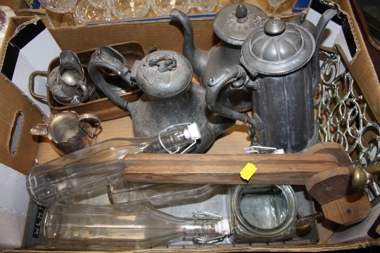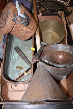 TWO TRAYS OF ASSORTED METALWARE TO INCLUDE A COPPER PLANTER, PEWTER COFFEE POTS ETC