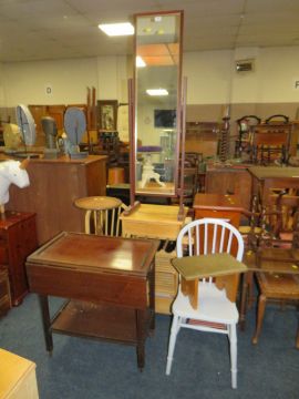 A QUANTITY OF ASSORTED FURNITURE TO INCLUDE CHEVAL MIRROR, KITCHEN TROLLEY STOOL ETC (8)