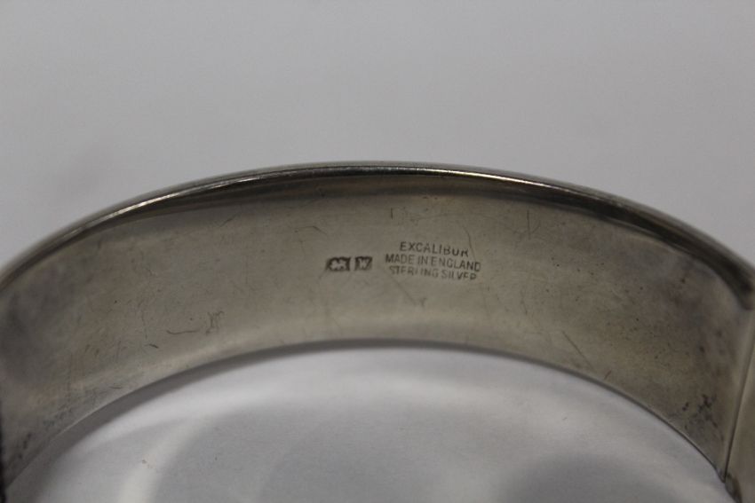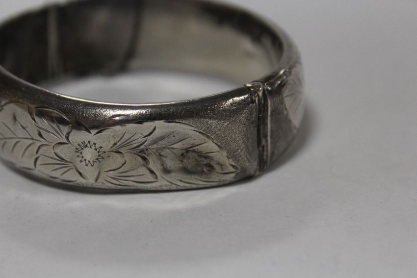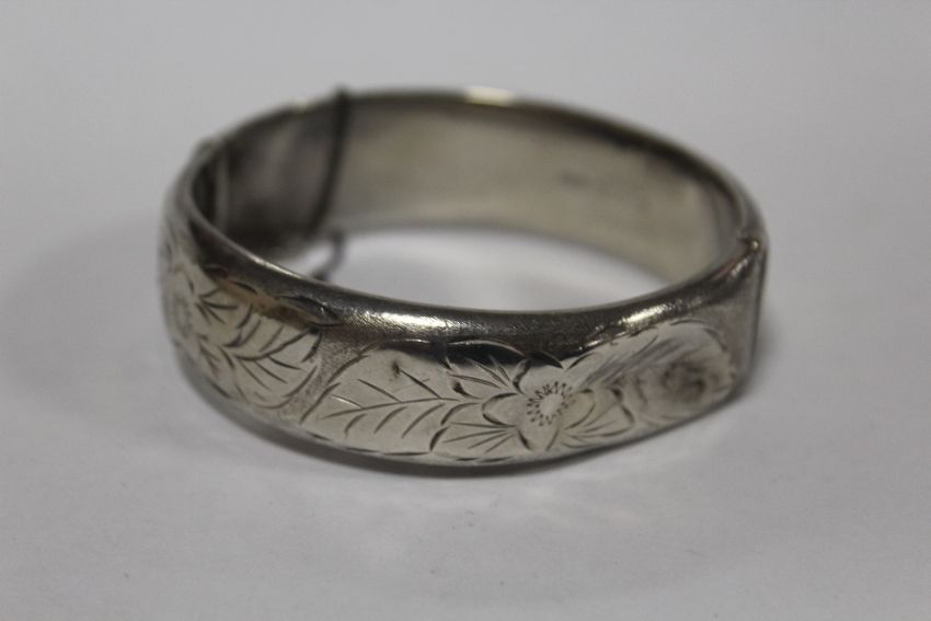 A HALLMARKED SILVER FLORALLY ENGRAVED BANGLE A/F - APPROX WEIGHT 26.8G