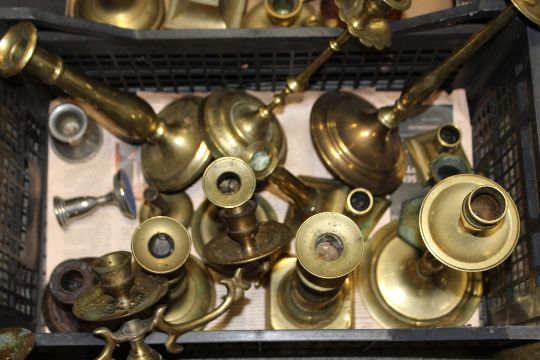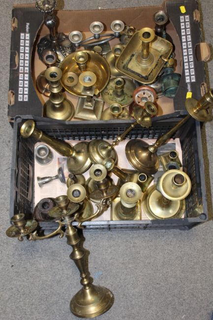 TWO TRAYS OF METAL CANDLESTICKS TO INCLUDE BRASS EXAMPLES