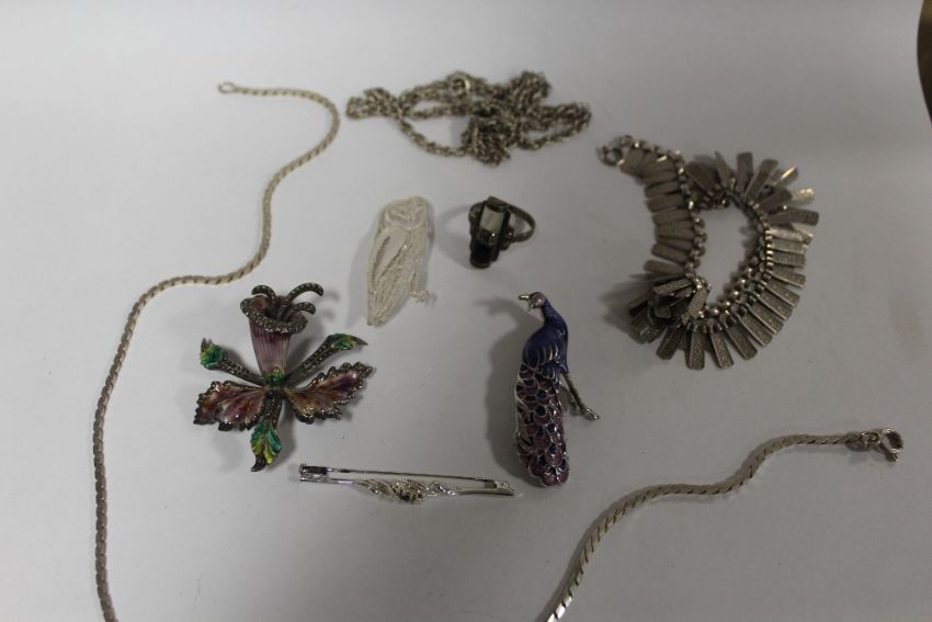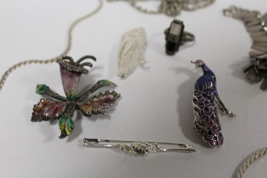 A BAG OF SILVER AND WHITE METAL JEWELLERY TO INCLUDE A STERLING SILVER AND ENAMEL PEACOCK BROOCH, MARCASITE RING, NECKLACES ETC.