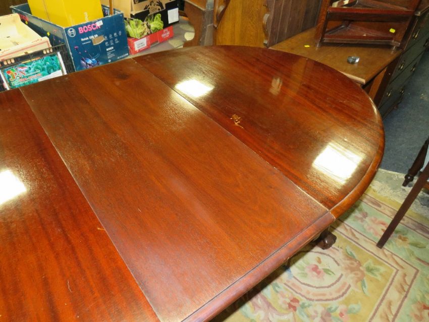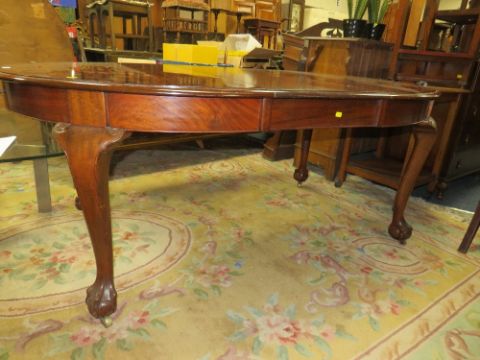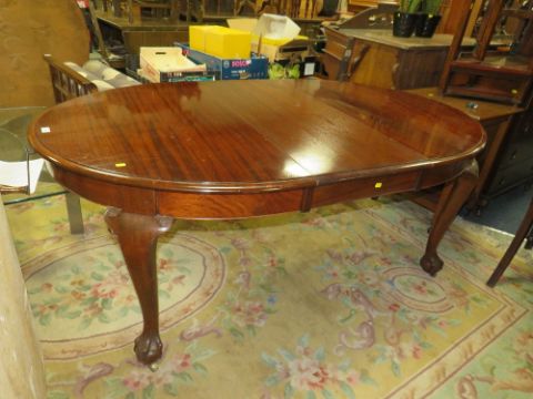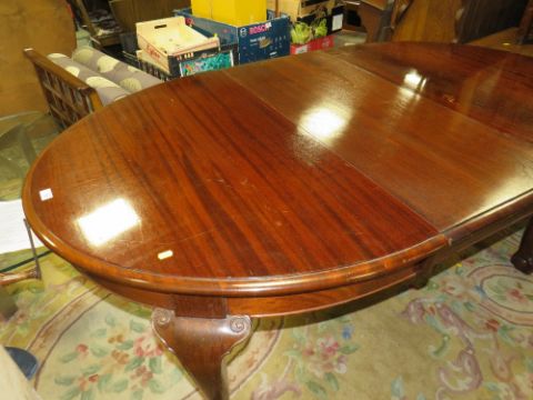 AN EARLY 20TH CENTURY MAHOGANY WIND-OUT DINING TABLE RAISED ON CABRIOLE SUPPORTS AND BALL AND CLAW FEET - ONE SPARE LEAF AND WINDER H-71 CM L-137 CM (L-181 CM EXTENDED)