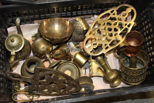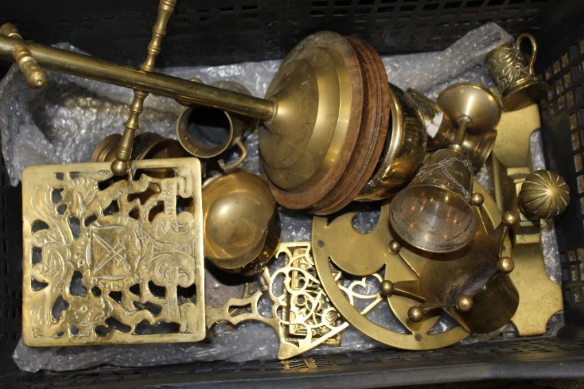THREE TRAYS OF ASSORTED BRASSWARE ETC