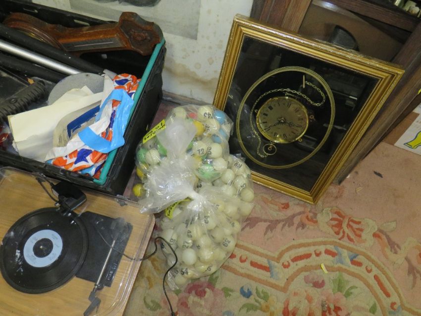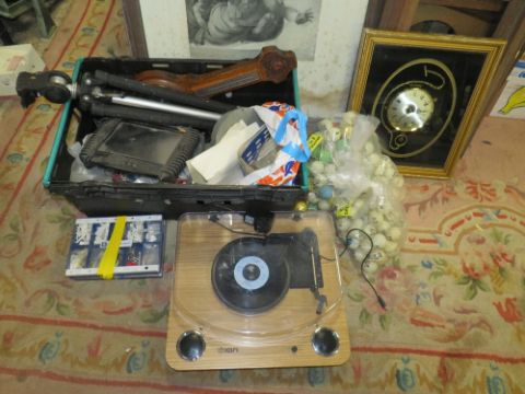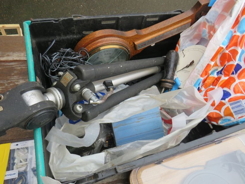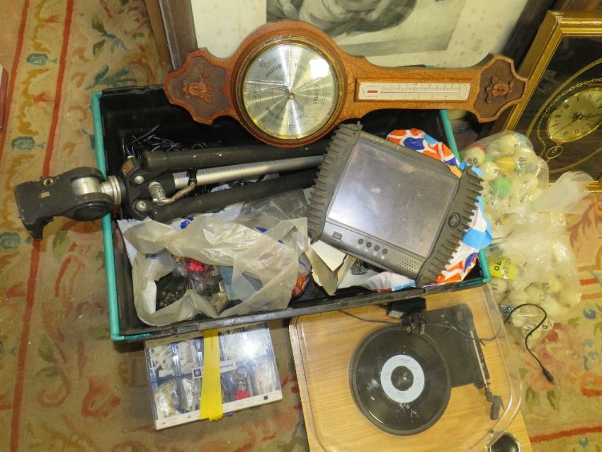 A SELECTION OF VARIOUS COLLECTABLES ETC TO INCLUDE ION TURNTABLE, SLICK MASTER VIDEO TRIPOD , assorted electrical components, wall clock and barometer A/F, radio control parts etc.