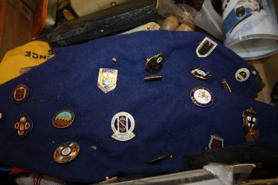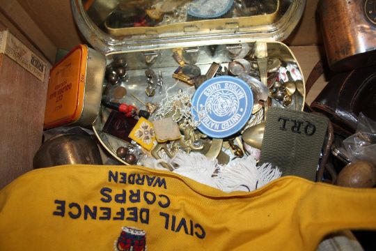 A TRAY OF ASSORTED COLLECTABLES TO INCLUDE MASONIC AND MILITARY BADGES ETC