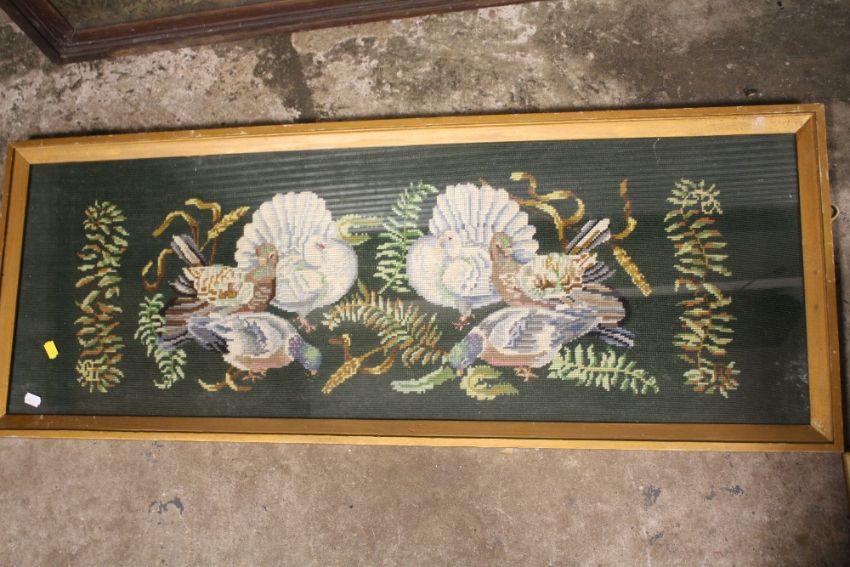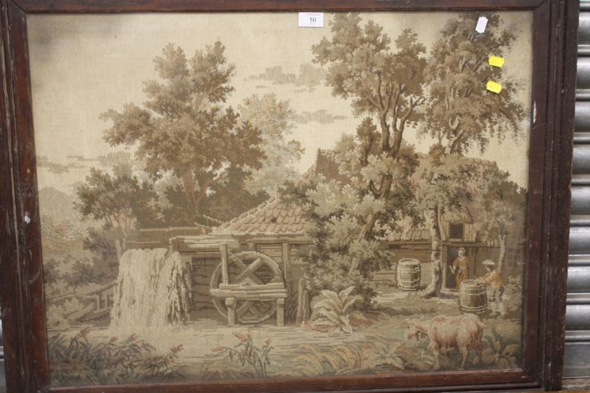 AN ANTIQUE OAK FRAMED AND GLAZED TAPESTRY DEPICTING A WATERMILL TOGETHER WITH A GILT FRAMED EXAMPLE OF BIRDS (2)