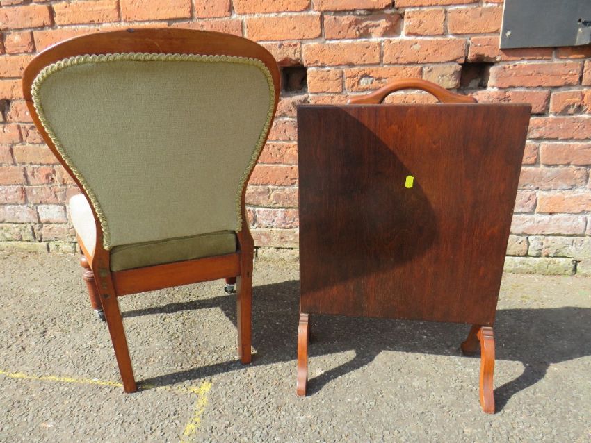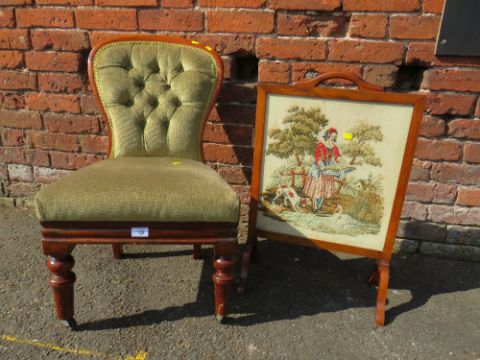 A VICTORIAN MAHOGANY FRAMED BEDROOM CHAIR AND A FIRESCREEN (2)