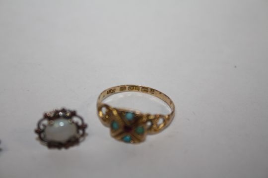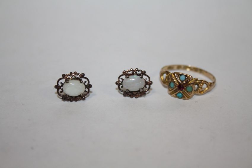A HALLMARKED 15 CARAT GOLD TURQUOISE AND RUBY RING, TOGETHER WITH A PAIR OF OPAL STYLE EARRINGS