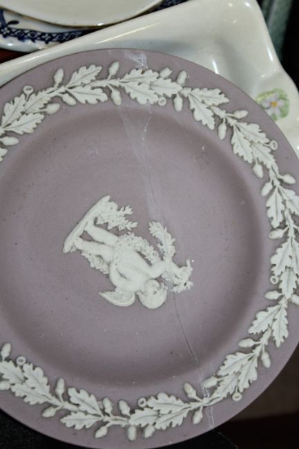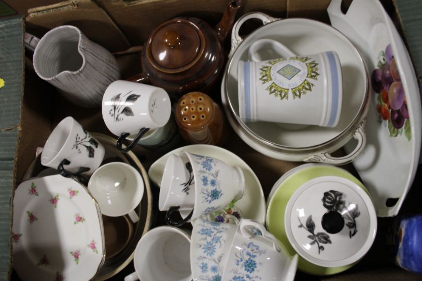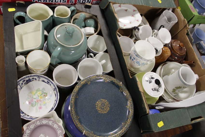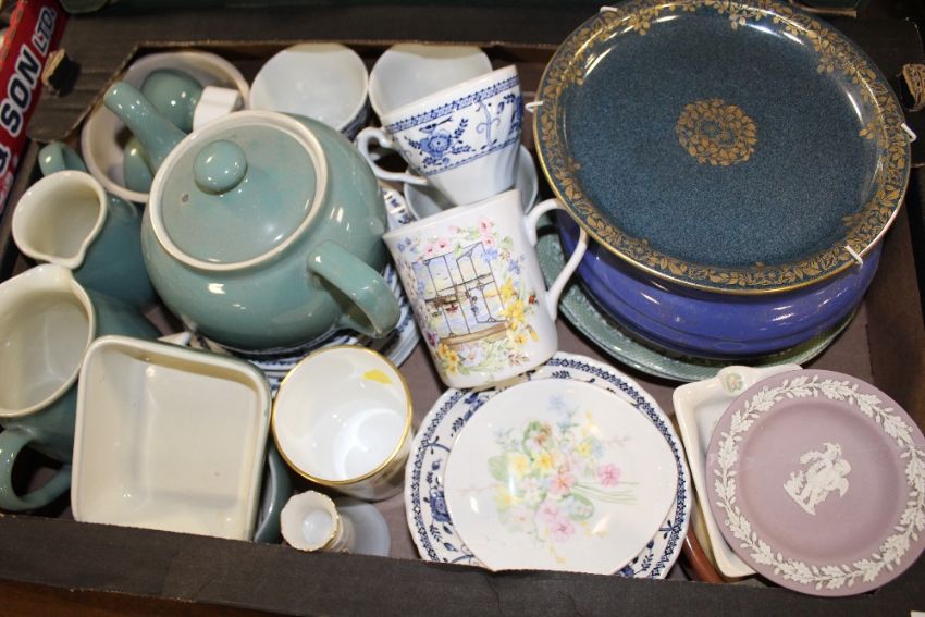 TWO TRAYS OF ASSORTED CHINA AND CERAMICS TO INCLUDE COLCLOUGH, WEDGWOOD JASPERWARE ETC