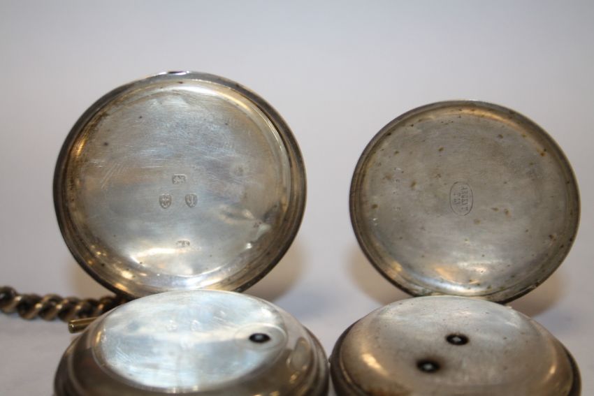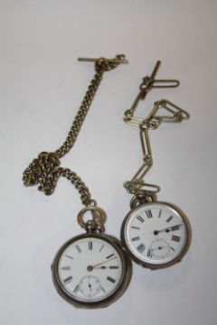 A HALLMARKED SILVER POCKET WATCH, TOGETHER WITH ANOTHER BOTH WITH ALBERT CHAINS