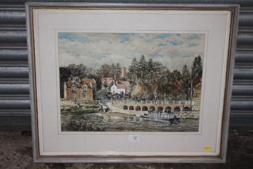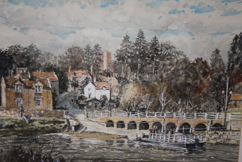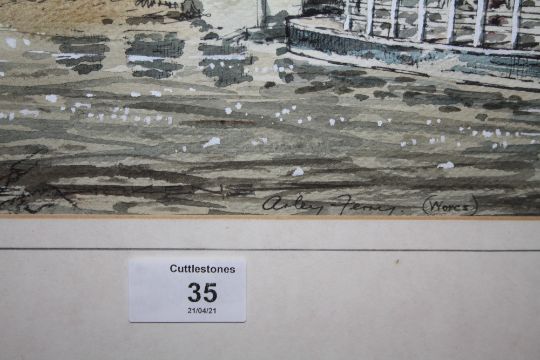 A FRAMED AND GLAZED WATERCOLOUR ENTITLED ARLEY FERRY (WORCS) SIGNED R W DICKENS LOWER CENTRE - 50.5 CM BY 36.5 CM