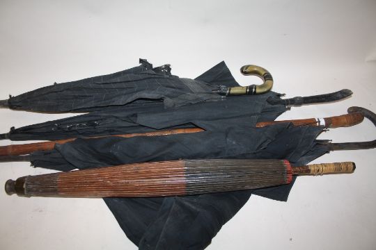 A CARVED BAMBOO WALKING CANE TOGETHER WITH FOUR VINTAGE PARASOLS A/F