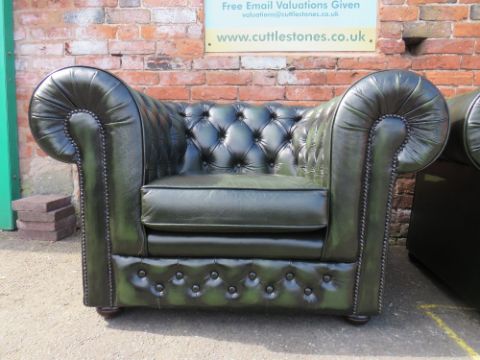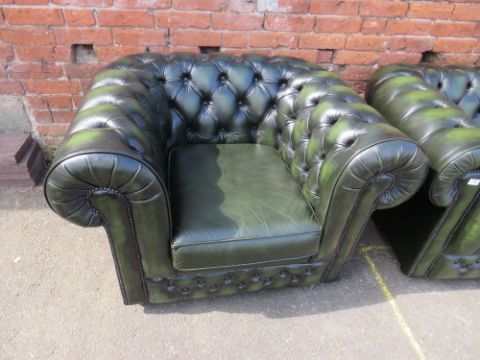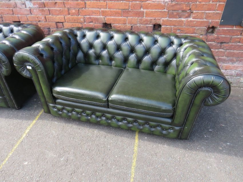 A THOMAS LLOYD GREEN LEATHER TWO PIECE CHESTERFIELD SUITE (2)