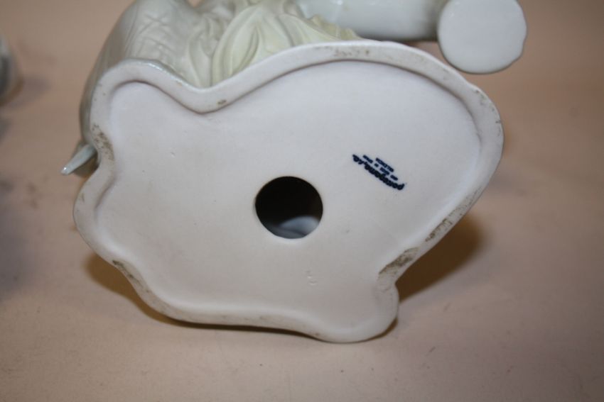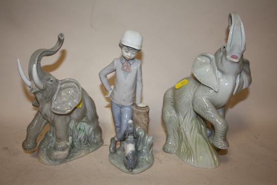 A NAO ELEPHANT FIGURE TOGETHER WITH ANOTHER AND A NAO FIGURE OF A BOY LEANING AGAINST A STUMP