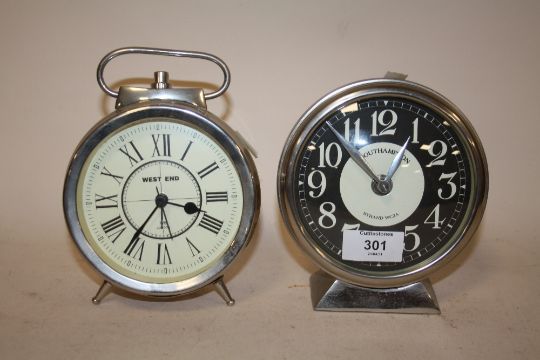 A MODERN WEST END ALARM CLOCK TOGETHER WITH A MODERN MANTEL CLOCK