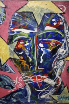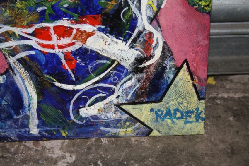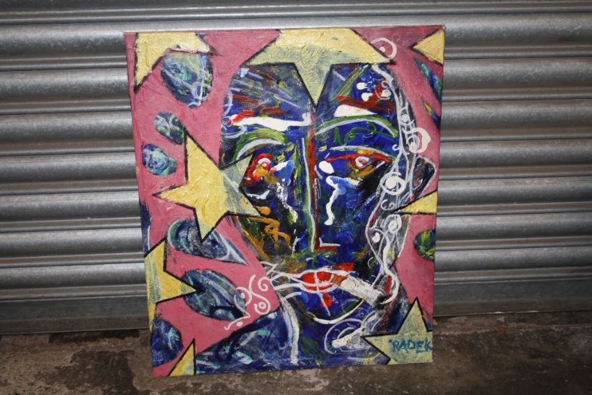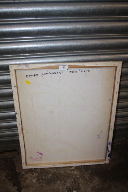 AN UNFRAMED ABSTRACT OIL ON CANVAS PORTRAIT STUDY SIGNED RADEK JANKONSKI - 60 CM BY 50 CM