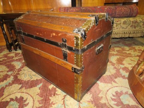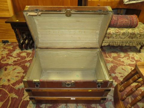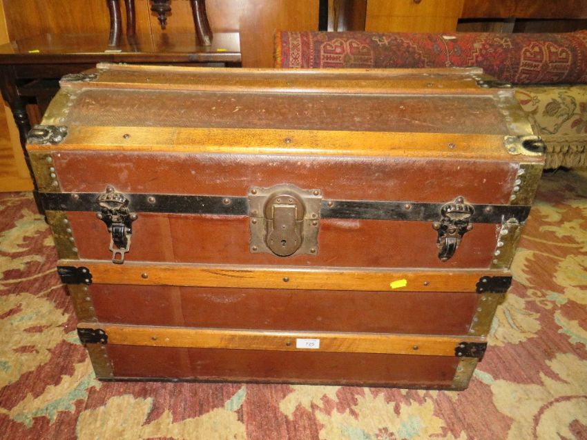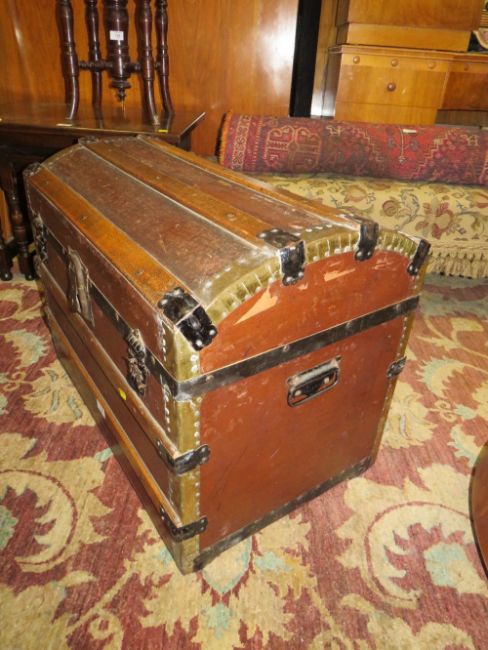 A VINTAGE DOMED BANDED PACKING TRUNK W-70 CM