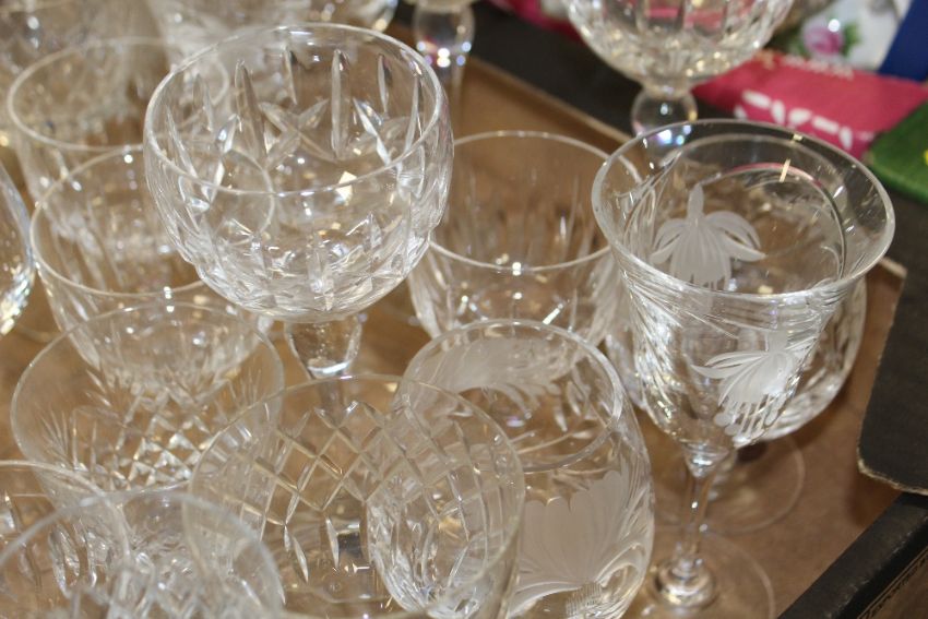 A TRAY OF CUT GLASS DRINKING GLASSES TO INCLUDE FUSHIA PATTERN EXAMPLES, VASE ETC