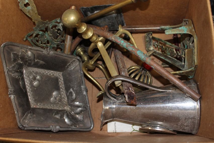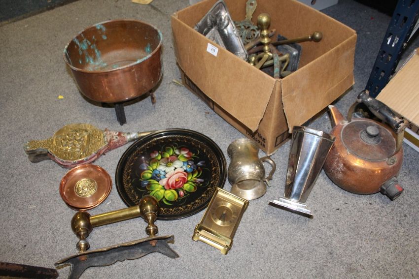 A BOX OF ASSORTED METALWARE TO INCLUDE COPPER AND BRASSWARE