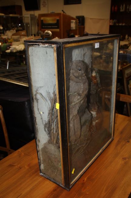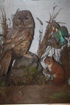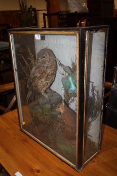 A GLASS CASED TAXIDERMY STUDY OF N OWL, RED SQUIRREL AND A KING FISHER, H 66.5 CM, W 53 CM D 19 CM