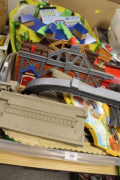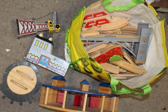 TWO BOX AND A BAG OF RAILWAY TOYS TO INCLUDE THOMAS THE TANK AND WOODEN BRIO STYLE EXAMPLES