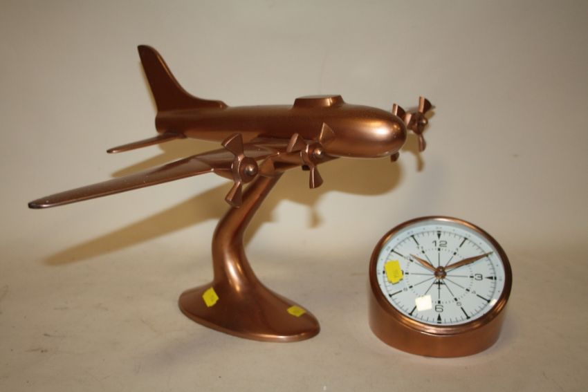 A MODERN DECORATIVE COPPER EFFECT MODEL OF AN AEROPLANE - WIDTH 56CM, HEIGHT 28CM - TOGETHER WITH A SIMILAR DESK CLOCK