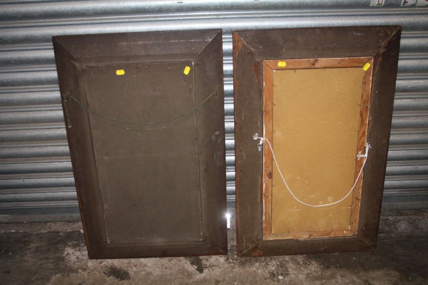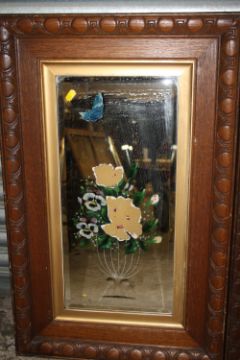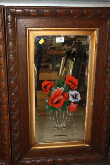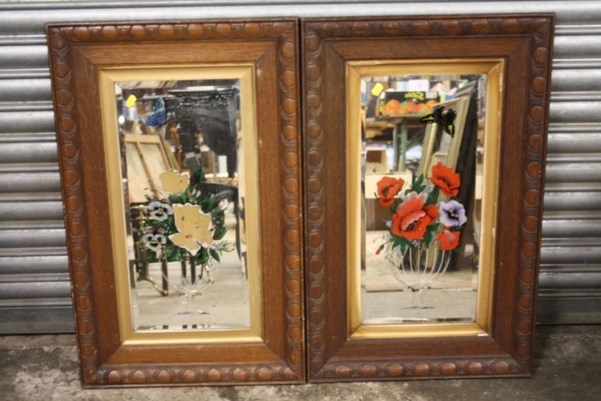 A PAIR OF VINTAGE OAK FRAMED FLORAL MIRRORS (ONE A/F) 82 CM BY 52 CM