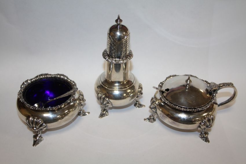 A LARGE HALLMARKED SILVER CONDIMENT SET - APPROX WEIGHT 565.4G