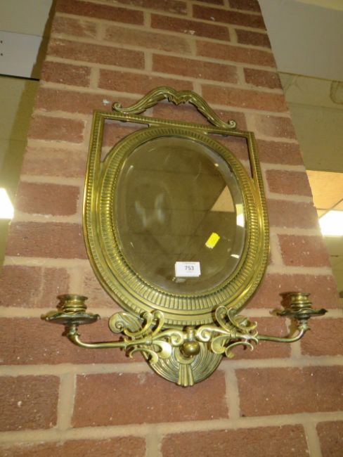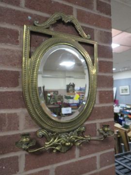 AN ORNATE BRASS WALL MIRROR WITH CANDLE SCONCES H-57 CM