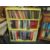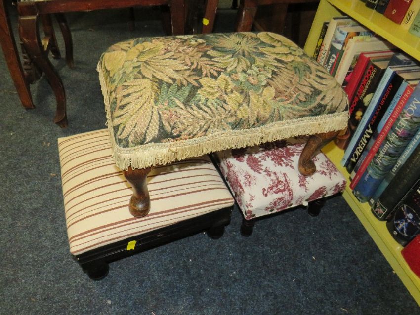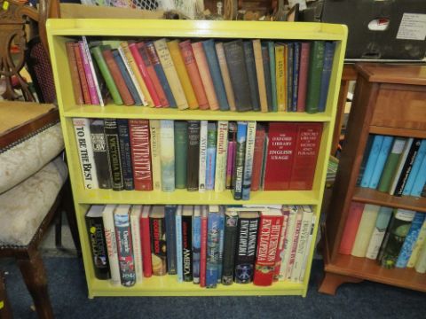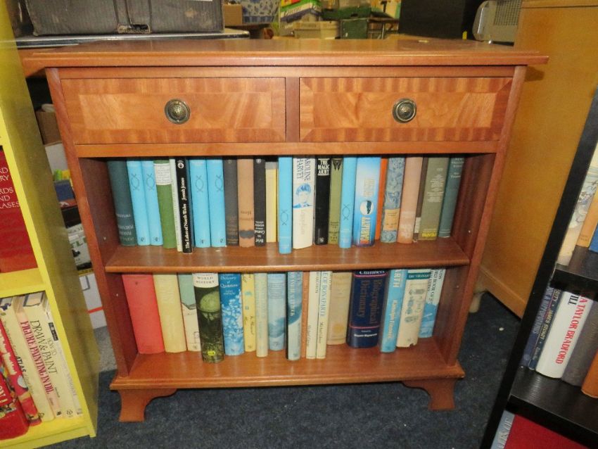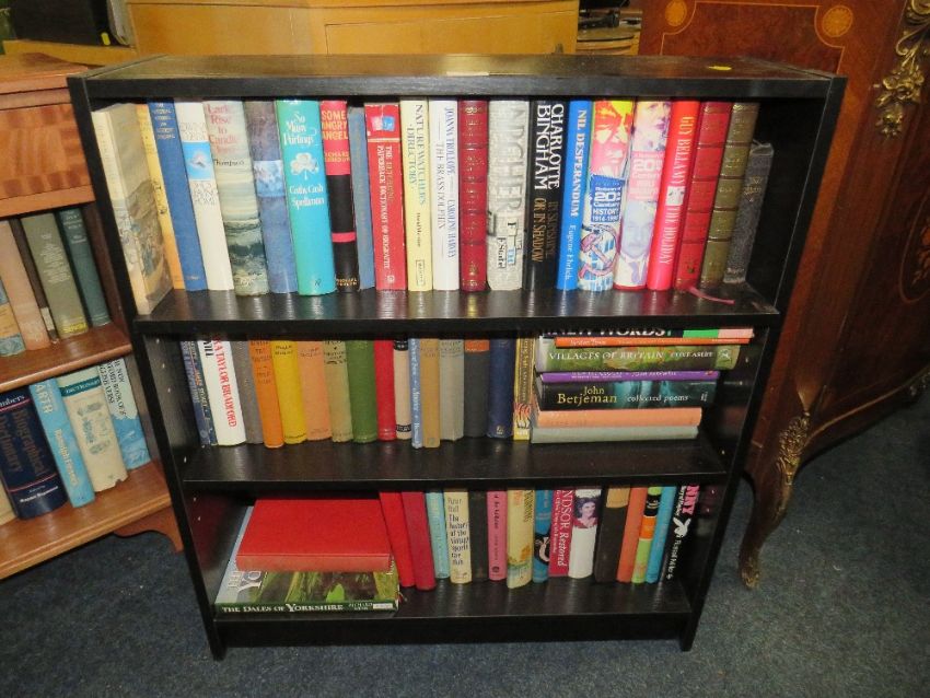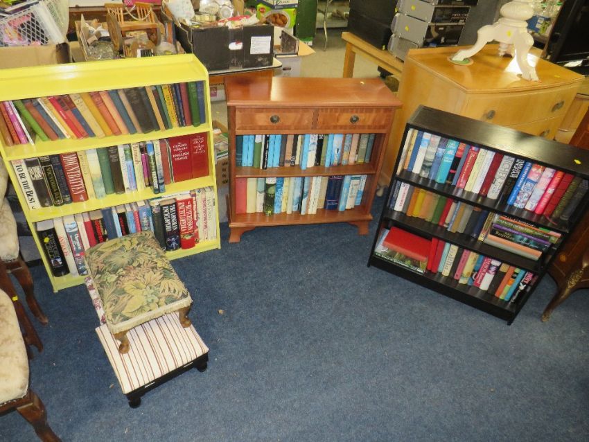 THREE MODERN OPEN BOOKCASES WITH ASSORTED BOOKS AND TWO STOOLS