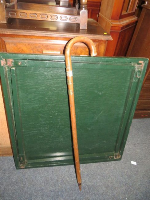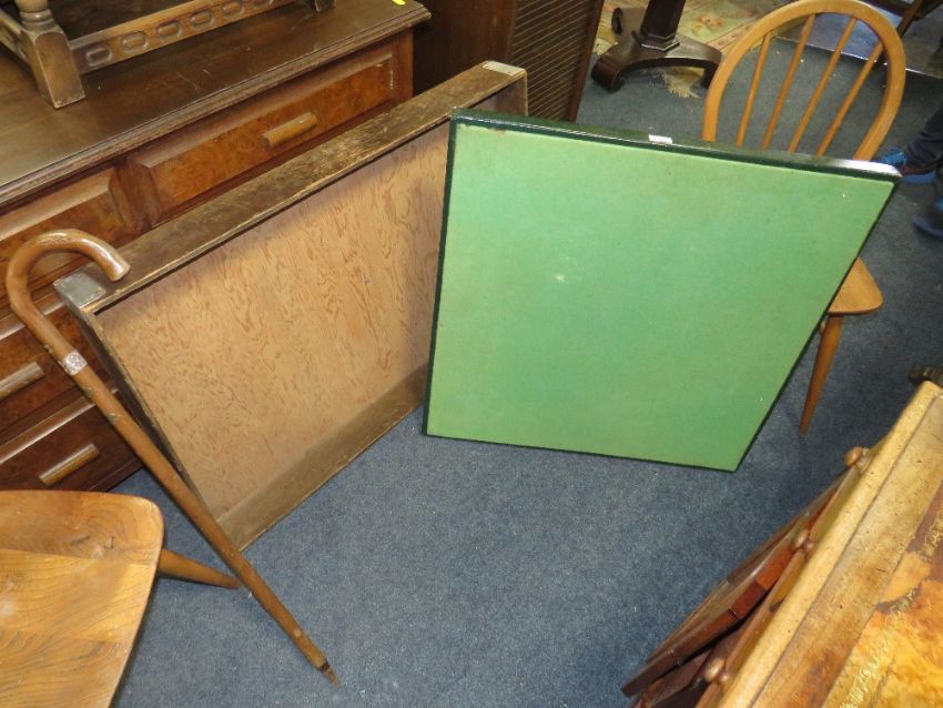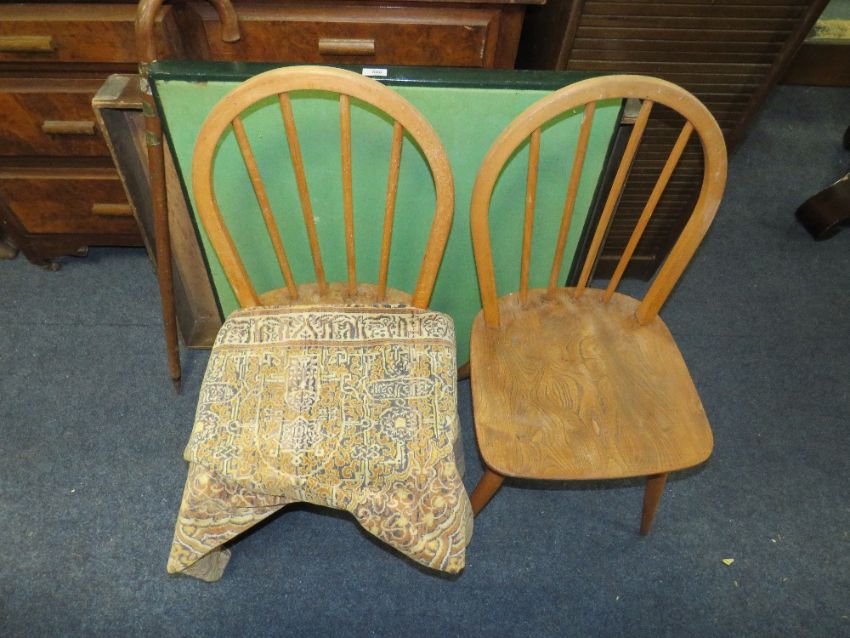 A PAIR OF VINTAGE HOOPBACK CHAIRS, WITH A STICK , LARGE TRAY, SMALL EASTERN RUG AND CARD TABLE (6)