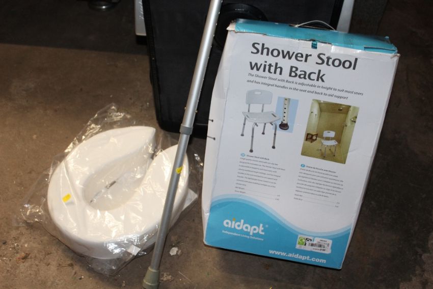 FOUR DISABILITY ITEMS TO INCLUDE A SHOWER STOOL, CRUTCH , COMMODE ETC