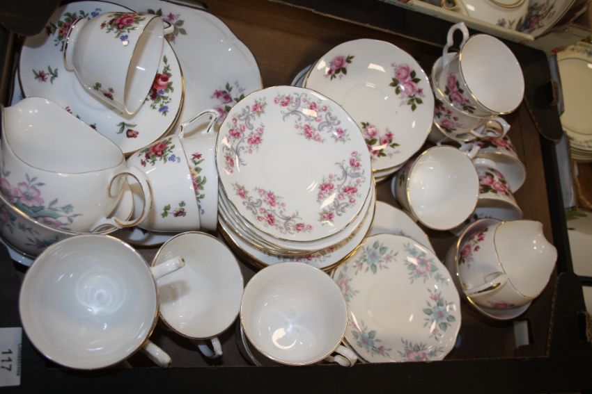 A TRAY OF ASSORTED CHINA TO INCLUDE QUEEN ANNE, COLCLOUGH ETC
