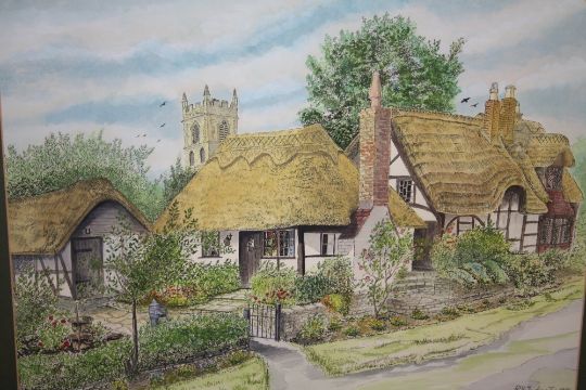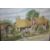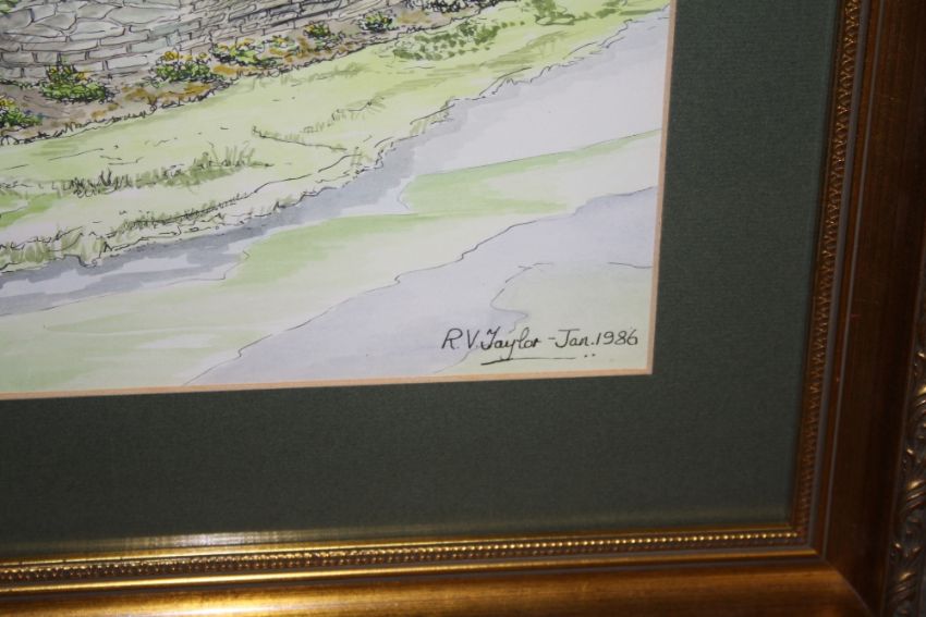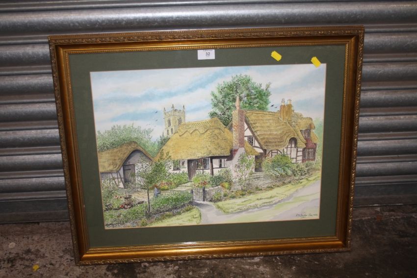 A GILT FRAMED AND GLAZED MIXED MEDIA OF THATCHED COTTAGES SIGNED R B TAYLOR 1986