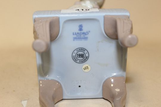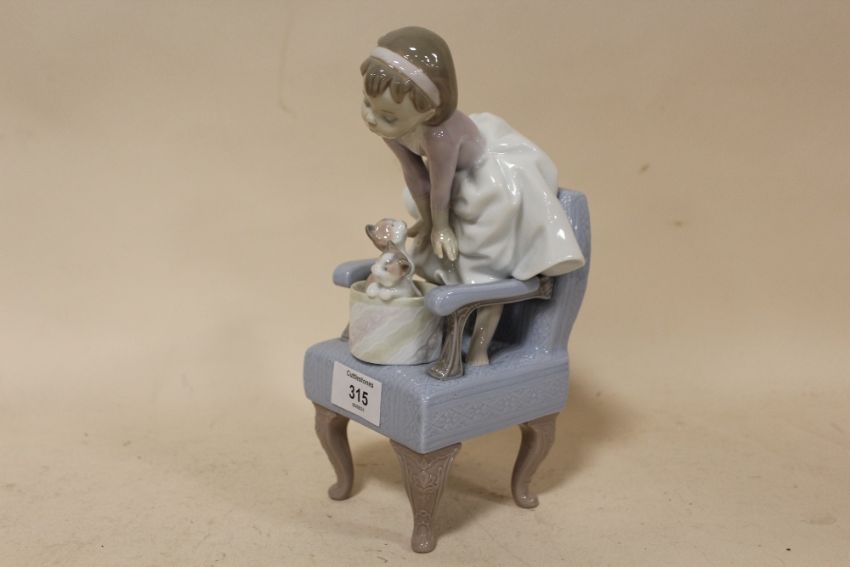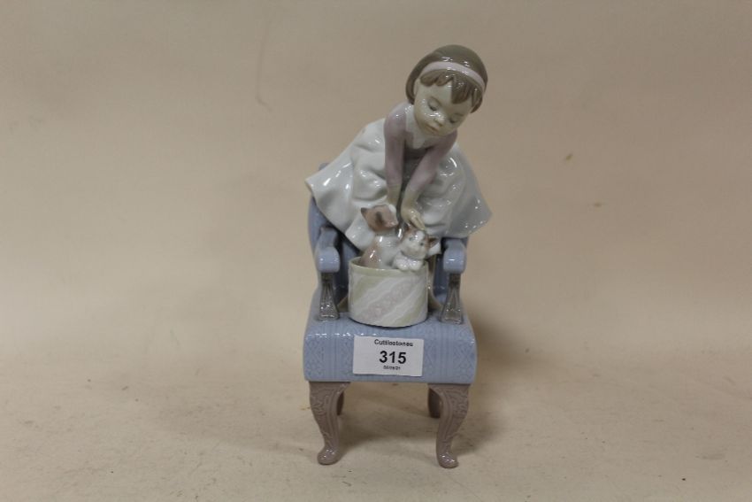 A LLADRO FIGURE OF A YOUNG GIRL STANDING ON AN ARM CHAIR WITH KITTENS MARKED 1998 EVENT FIGURINE 6512 TO BASE HEIGHT - 24CM