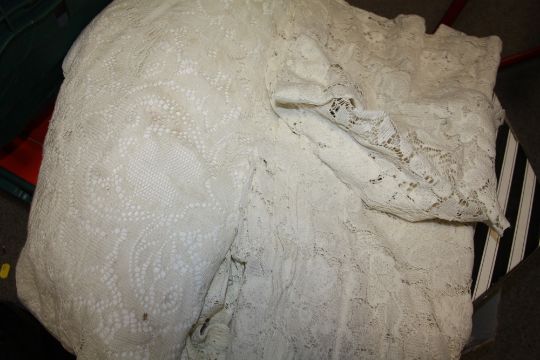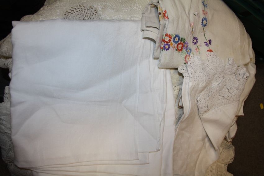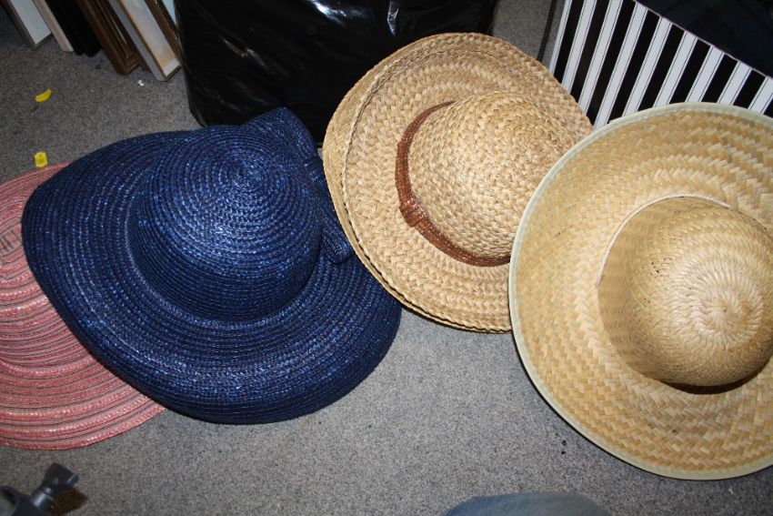 A BOX OF LADIES HATS TOGETHER WITH A BAG OF VINTAGE LINEN
