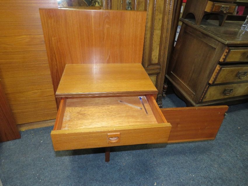 A RETRO PAIR OF TEAK BEDSIDE CABINETS WITH A HEADBOARD