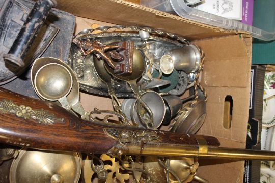 A BOX OF BRASS AND SILVER PLATED WEAR TO INCLUDE A BRASS GUN